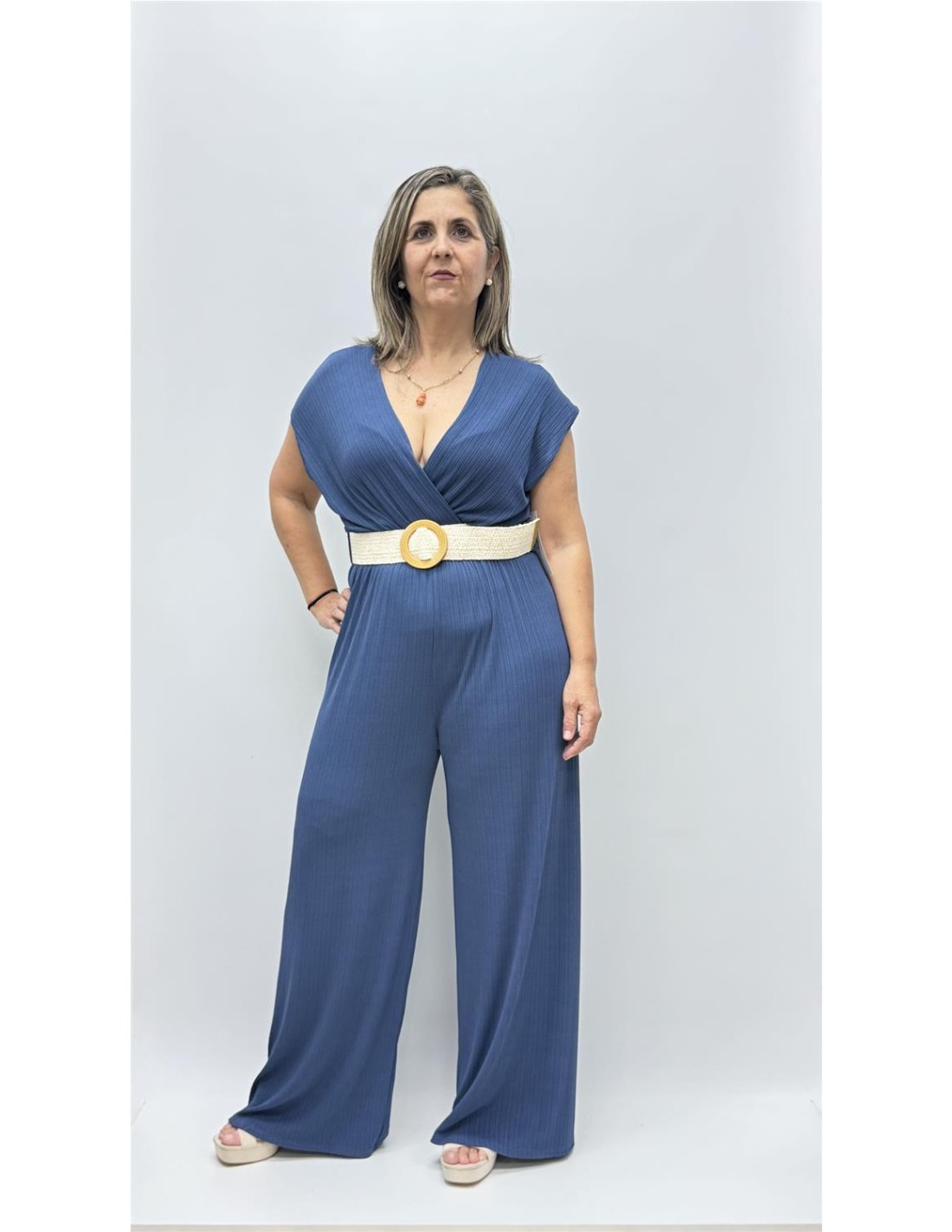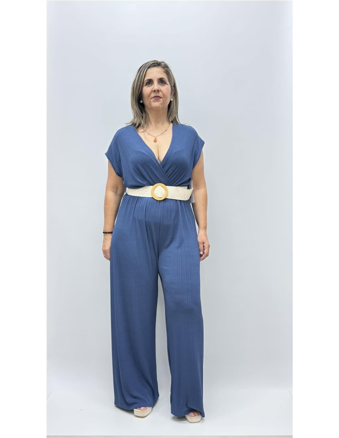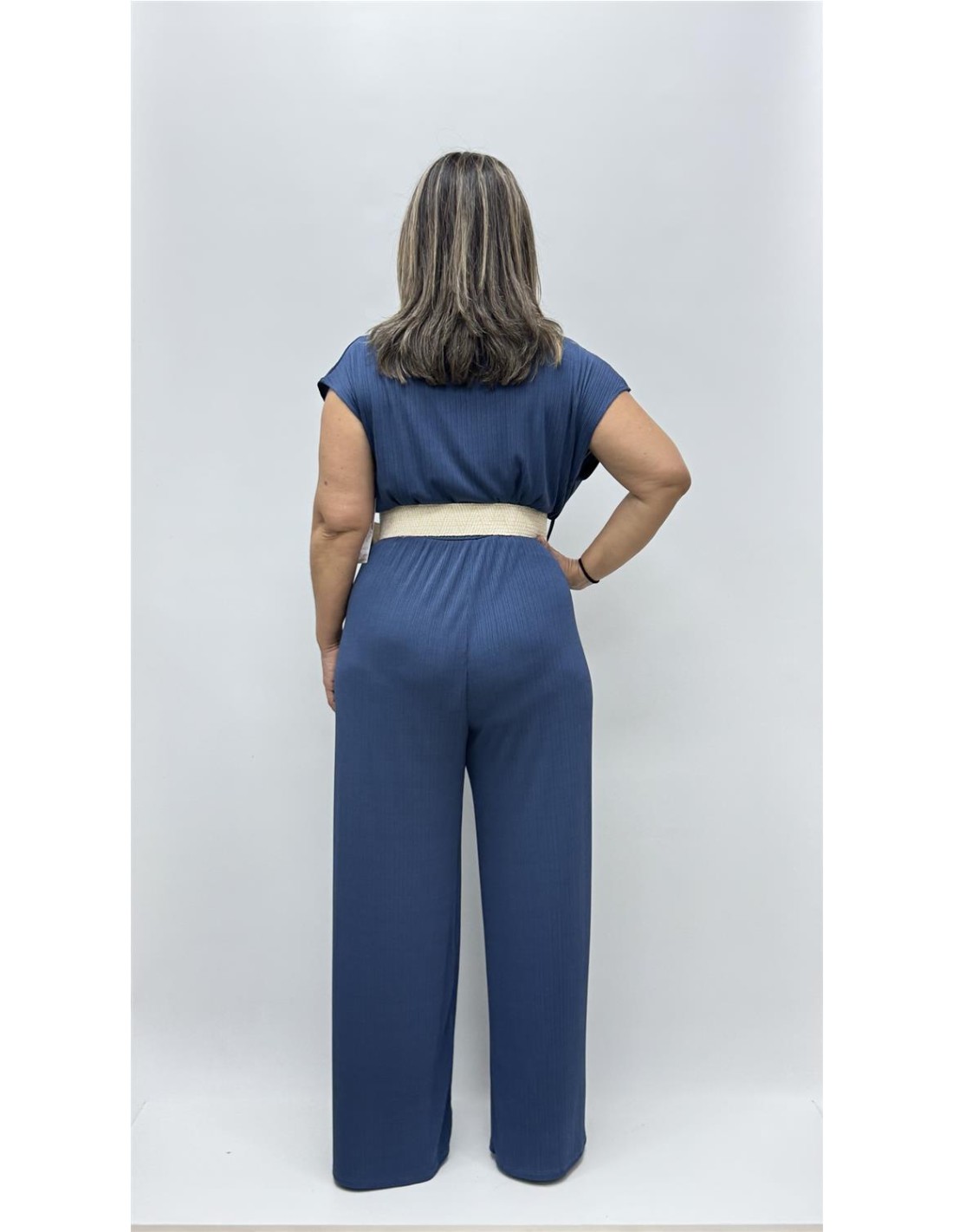 Mono de licra con cinturon de pata ancha y escote cruzada, es de talla unica y aprox da desee la 36 hasta la 42