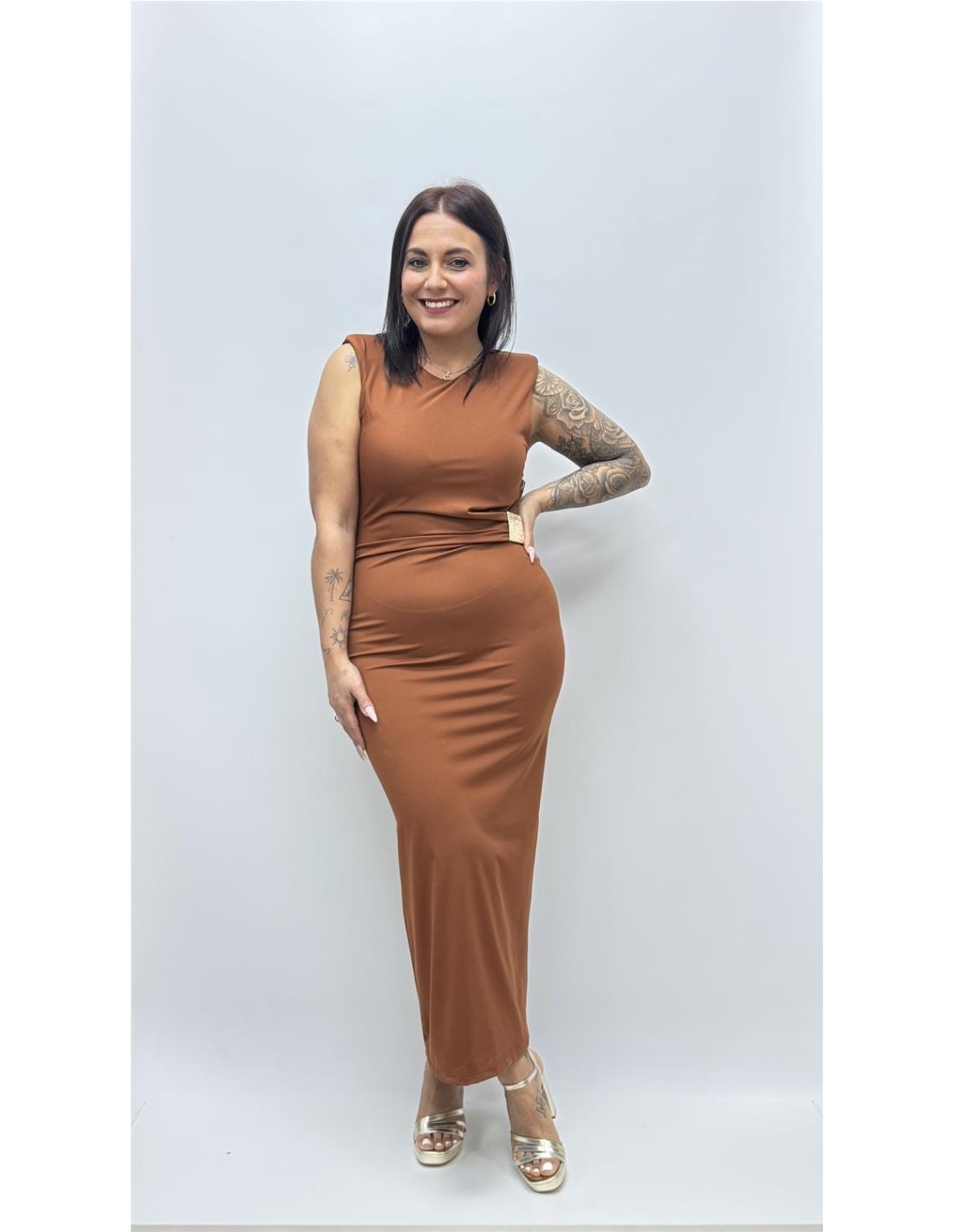 Vestido de licra fria, adorno metalico y raja trasera, es de talla unica dando aprox desde la 36 hasta la 42.