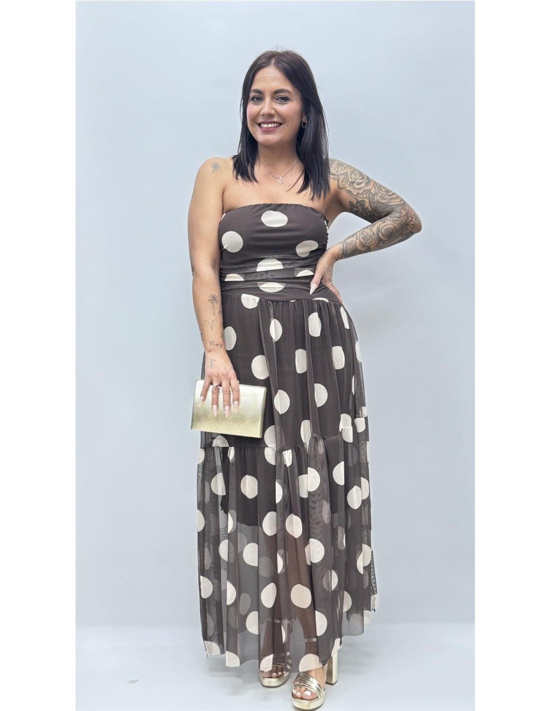 Vestido de gasa de palabra de honor, largo midi, es de talla unica dando aprox desde la 36 hasta la 44.